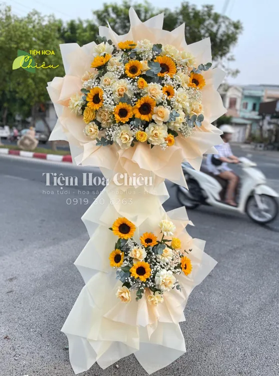 Vì vậy, sử dụng hoa hướng dương để cắm những kệ hoa khai trương, lẵng hoa khai trương, giỏ hoa khai trương nhỏ,… sẽ tạo nên những mẫu hoa khia trương thật đẹp để mừng ngày quan trọng.